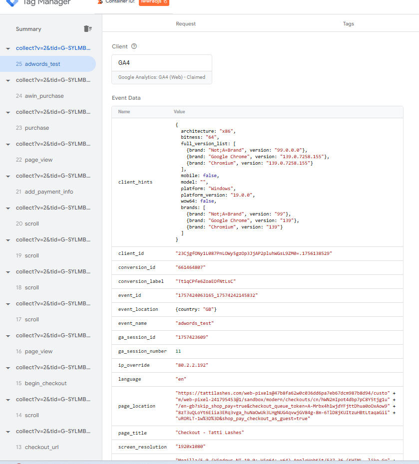 I did breifly see events that fire on “purchase_stape” appear in sGTM, but now they aren’t again - which is what you see in the screengrab where you can see purcahse, awin_purchase and adwords_test