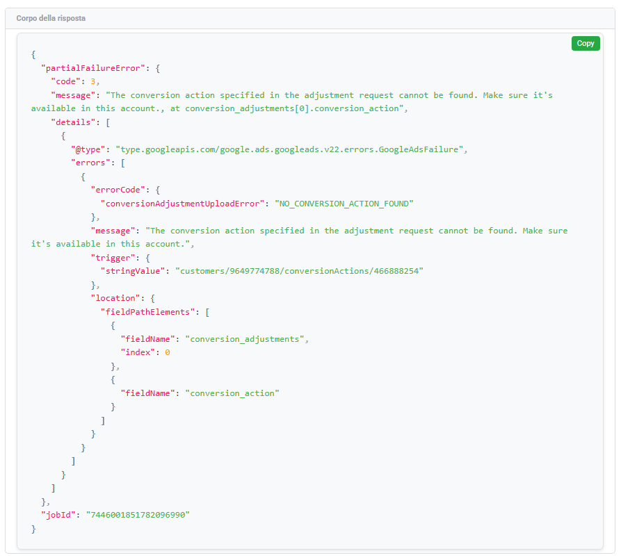 "message": "The conversion action specified in the adjustment request cannot be found. Make sure it's available in this account., at conversion_adjustments[0].conversion_action",