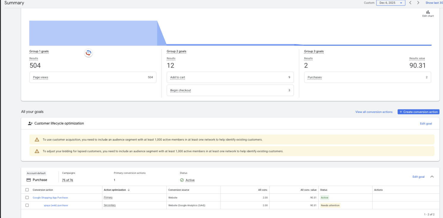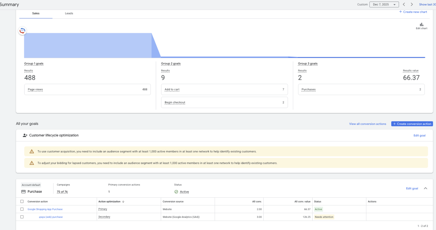 On December 7, we received 9 orders, but only 2 are displayed in the Google Ads account