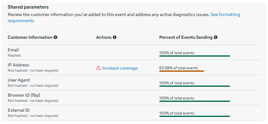 For the event CompleteRegistration I am using server-side tracking only (no client-side events) with the official Stape Meta Conversion API template. Everything is working fine overall, but I’ve noticed that in Meta Events Manager, the IP address coverage is only around 63%, while other fields like email, user agent, and fbp all show 100%.