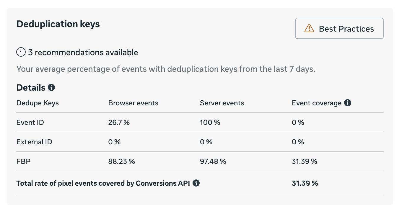 I am using sGTM with CAPI along with the Event ID Template by Stape. I have several events that seem to be doing fine with event coverage and deduplication with this setup with over 90% event coverage, but for some reason PageView events get stuck at 35% or lower, even though it’s set up the same way. I went and tested to make sure deduplication was working by visiting a random page: