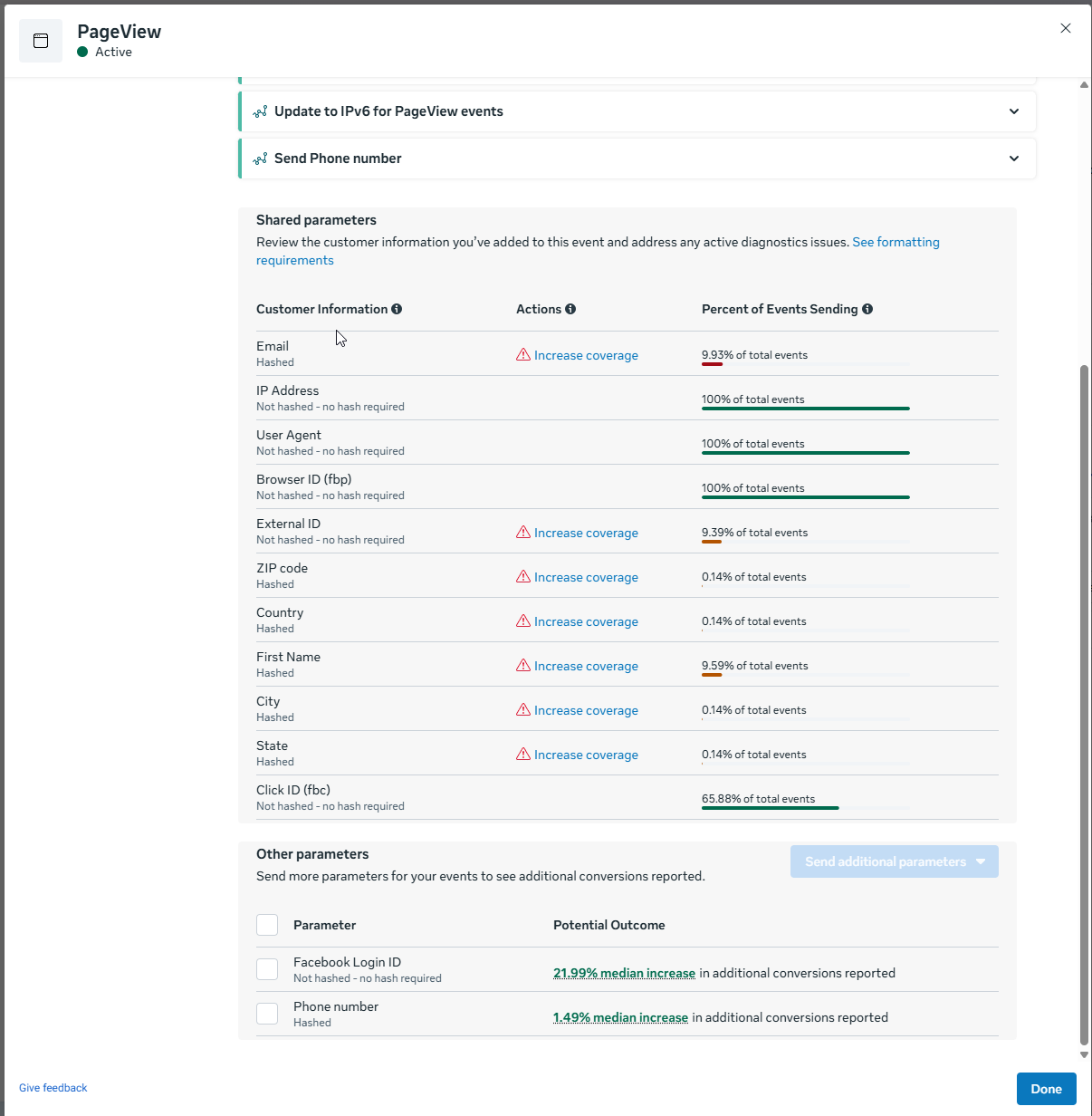 Treat that with a grain of salt. Your fbc coverage on page_view is 60%.