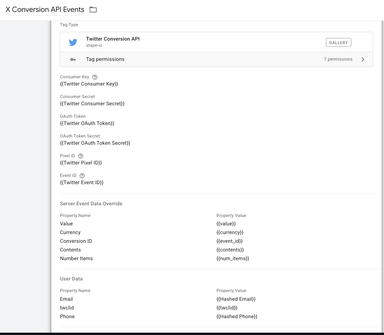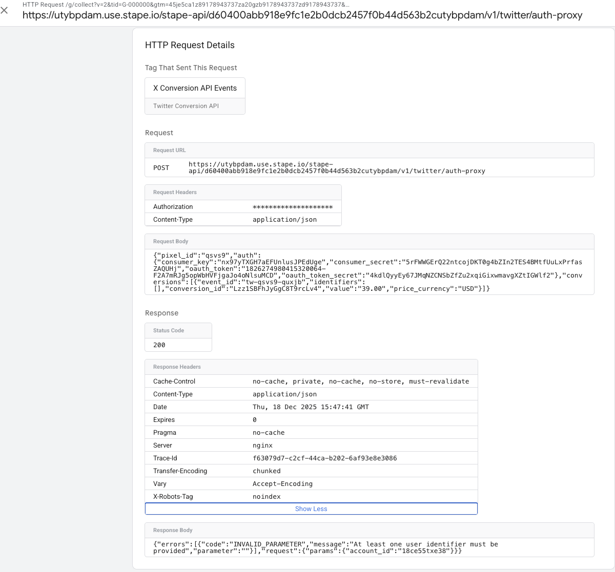We are trying to implement the Twitter Conversion API for a client. We used Stape sGTM hosting, and are using the Stape Twitter Conversion API template tag in the GTM server container.
