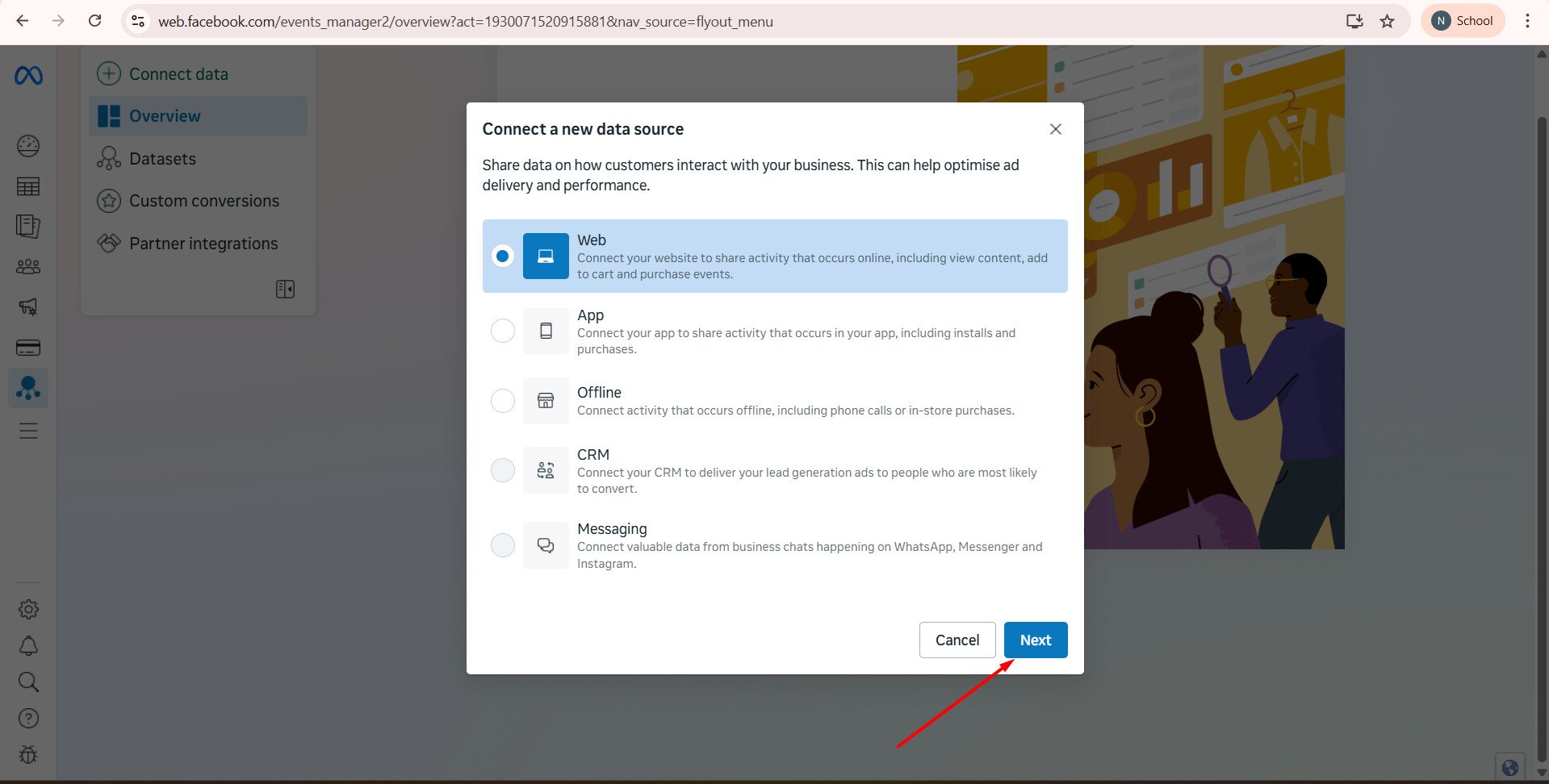 The issue has been resolved. I selected the user from top right corner and it was showing no user under Business Portfolio. I create a new user with same name, same email address as used in Facebook account creation. Selected that newly created user and try to create a new app under Connect to Data. It was created this time, showed next steps and tracking pixel as well. So, overall it was permission related issue.